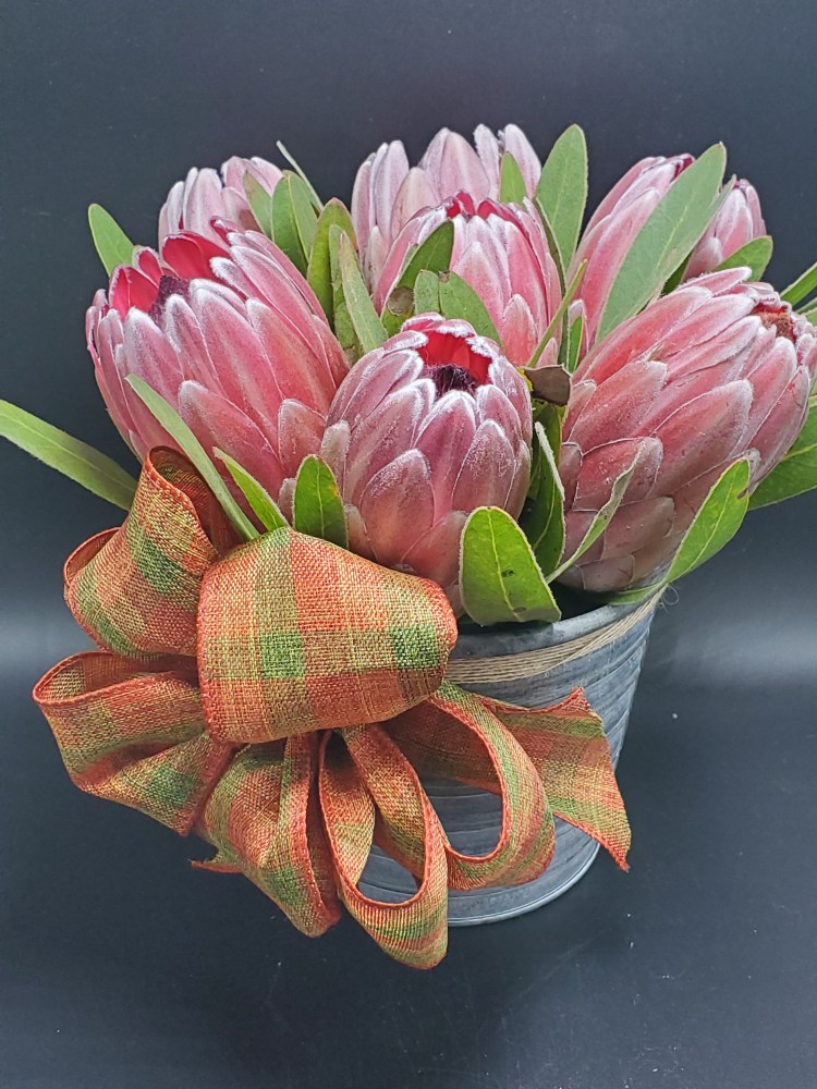 Special order arrangements, filled with fresh cut Protea flowers and greenery